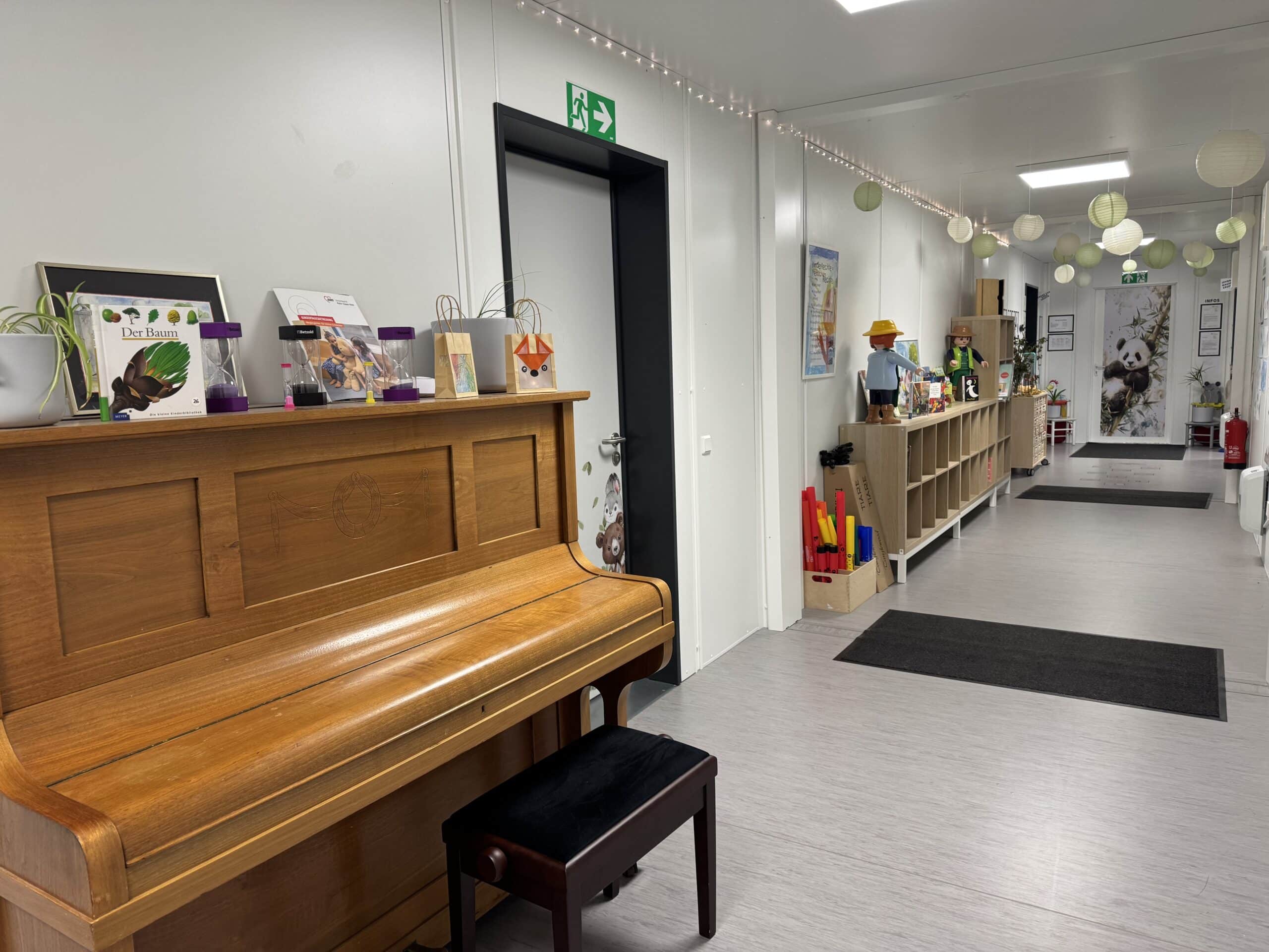 Da die 50jährige Kita nicht mehr den grundlegenden Anforderungen in vielen Bereichen standhalten konnte, sind wir mit unserer Kita für eine Übergangszeit in eine Modulanlage gezogen, die wir uns schön eingerichtet haben. Die alte Kita wird nun abgerissen und es entsteht am gleichen Ort eine neue und moderne Einrichtung.