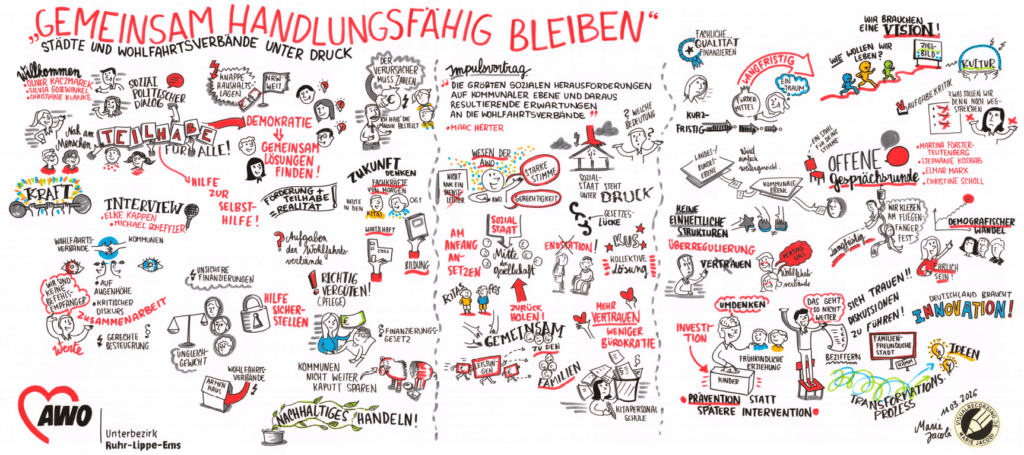 In seinem anschließenden Impulsvortrag forderte Hamms Oberbürgermeister Marc Herter, den Sozialstaat wieder aktiv in der Mitte der Gesellschaft zu verankern. Er warnte vor einer politisch wie kommunikativ zunehmenden Abwertung sozialstaatlicher Leistungen und plädierte für weniger Misstrauen und Bürokratie im Umgang mit freien Trägern. Nur in gemeinsamer Verantwortung ließen sich Strukturen schaffen, die Kindern, Familien, Pflegebedürftigen und Kommunen gleichermaßen zugutekommen.